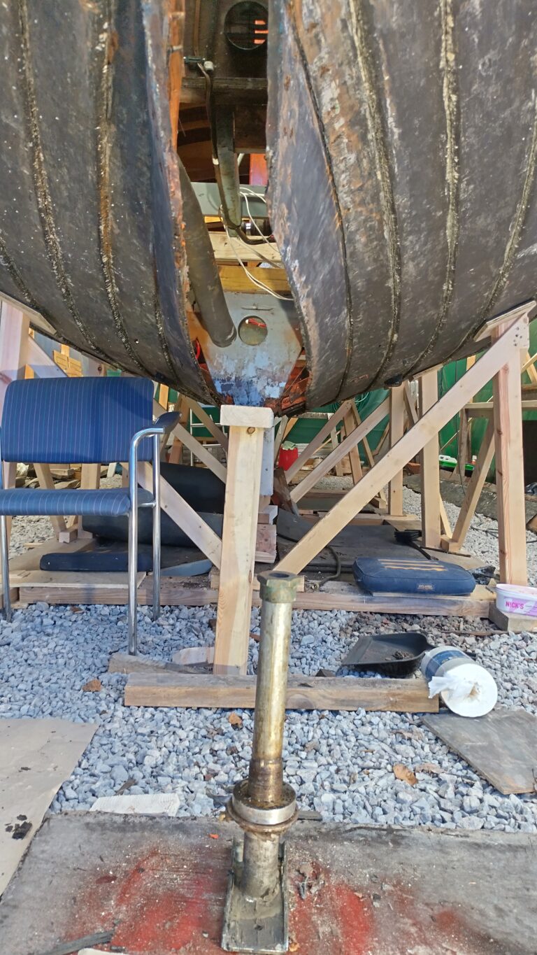 Nu har jag fått bort alla rör och axlar som tillhör framdrivningen av båten. Dessutom har jag lyckats få bort de fyra kölbultarna som håller ihop akterpartiet kring propelleraxeln. Med en hel del våld och hjälp av spett, skruvöglor och en tyngre bilhammare samt kompisen Tobbe fick vi ur de ca 50 cm långa kölbultarna.